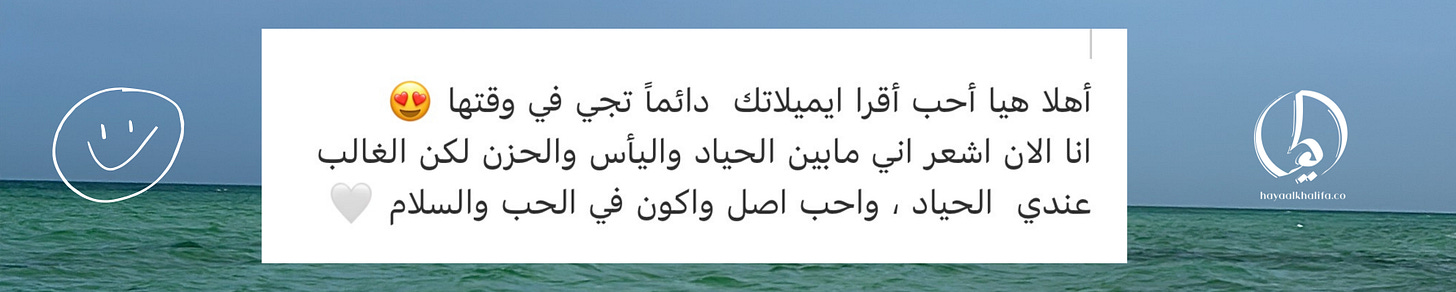إخترت أن أشارك معك الصبر كفكرة رئيسية هذا الأسبوع لأنه فعلاً لقيت إنه مفتاح الفرج والصبر الي تعلمته هو الصبر على المشاعر و الأفكار و ليس على الحالة حتى تتحسن، بل على المشاعر التي تأتي مع الحالة التي لا تسرنا و لم تكن جزء من الخطة! أريدك أن تجهز/ي دفترك و قلمك و تشوف شنو يظهر لك حين تتفكر في الصبر بالنسبة لك؟ و لما تخلص تكتب معنى الصبر بالنسبة لك في التعليق أسفل المقالة أو بالرد على الإيميل و هل نظرت الى هذه الوجهة الي هي الصبر على المشاعر التي تأتي مع الحالة التي لا تسرنا؟!